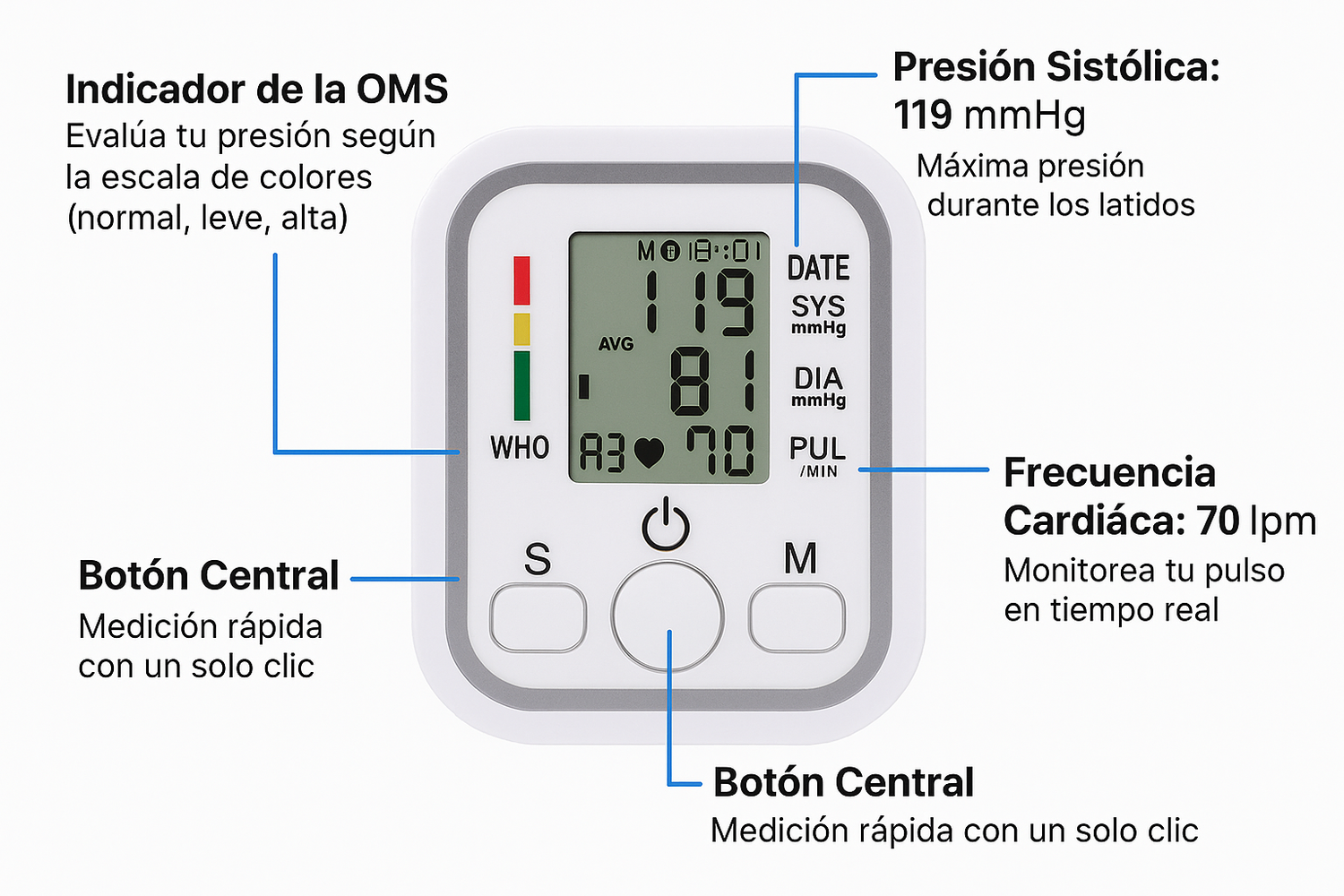 Mide tu presión arterial 🩺 y pulso 💓 en segundos con solo un botón. Pantalla clara 📟 e indicador de colores 📊 para interpretar fácilmente. Ideal para adultos mayores 👵 y personas con hipertensión ⚠️.